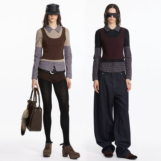 Fake Layered Plaid Polo Long Sleeve T-shirt