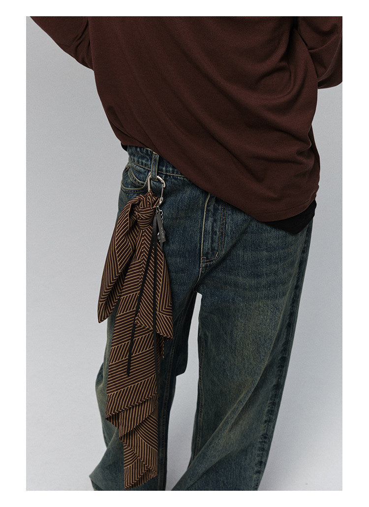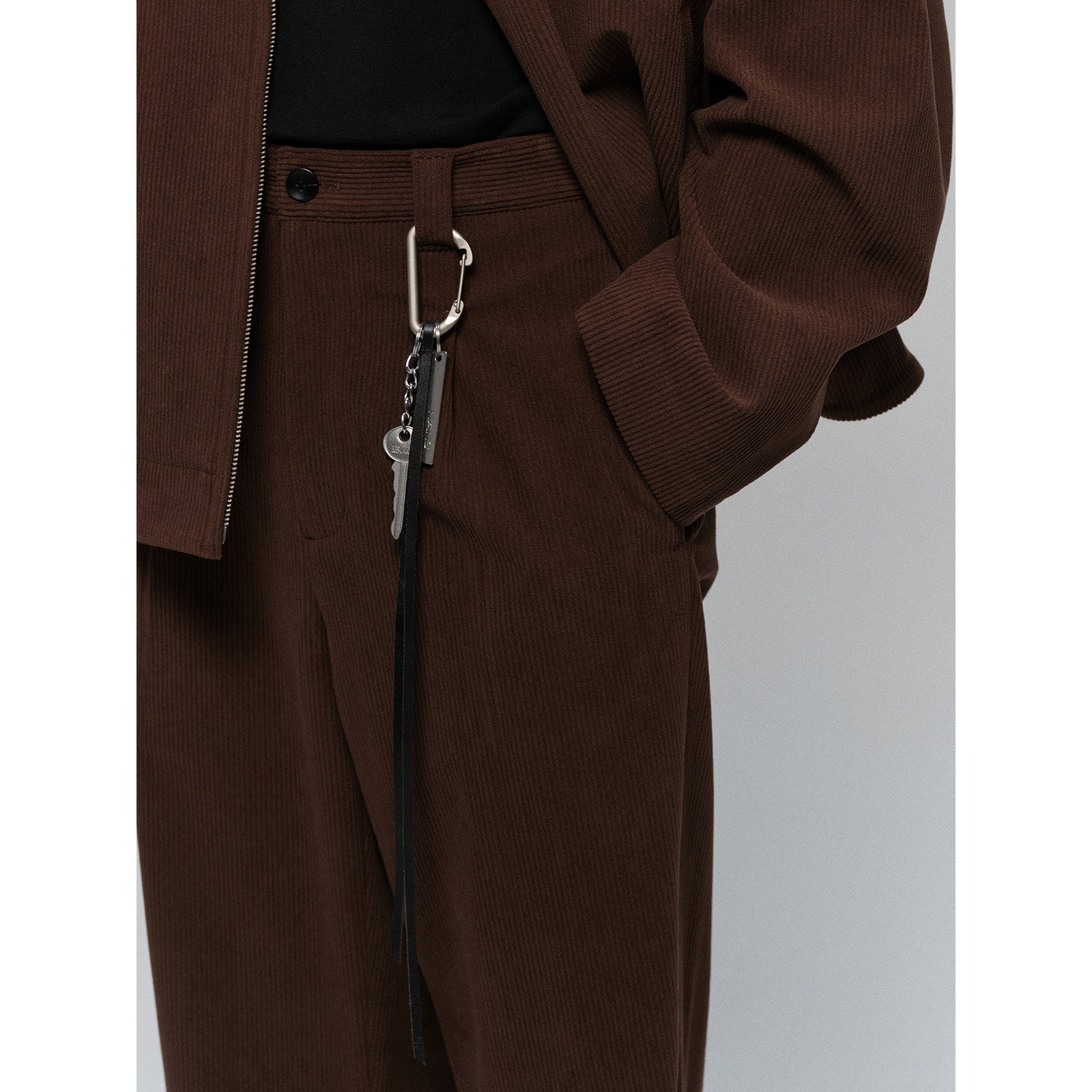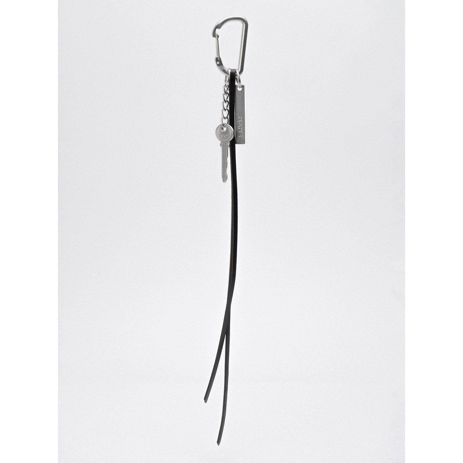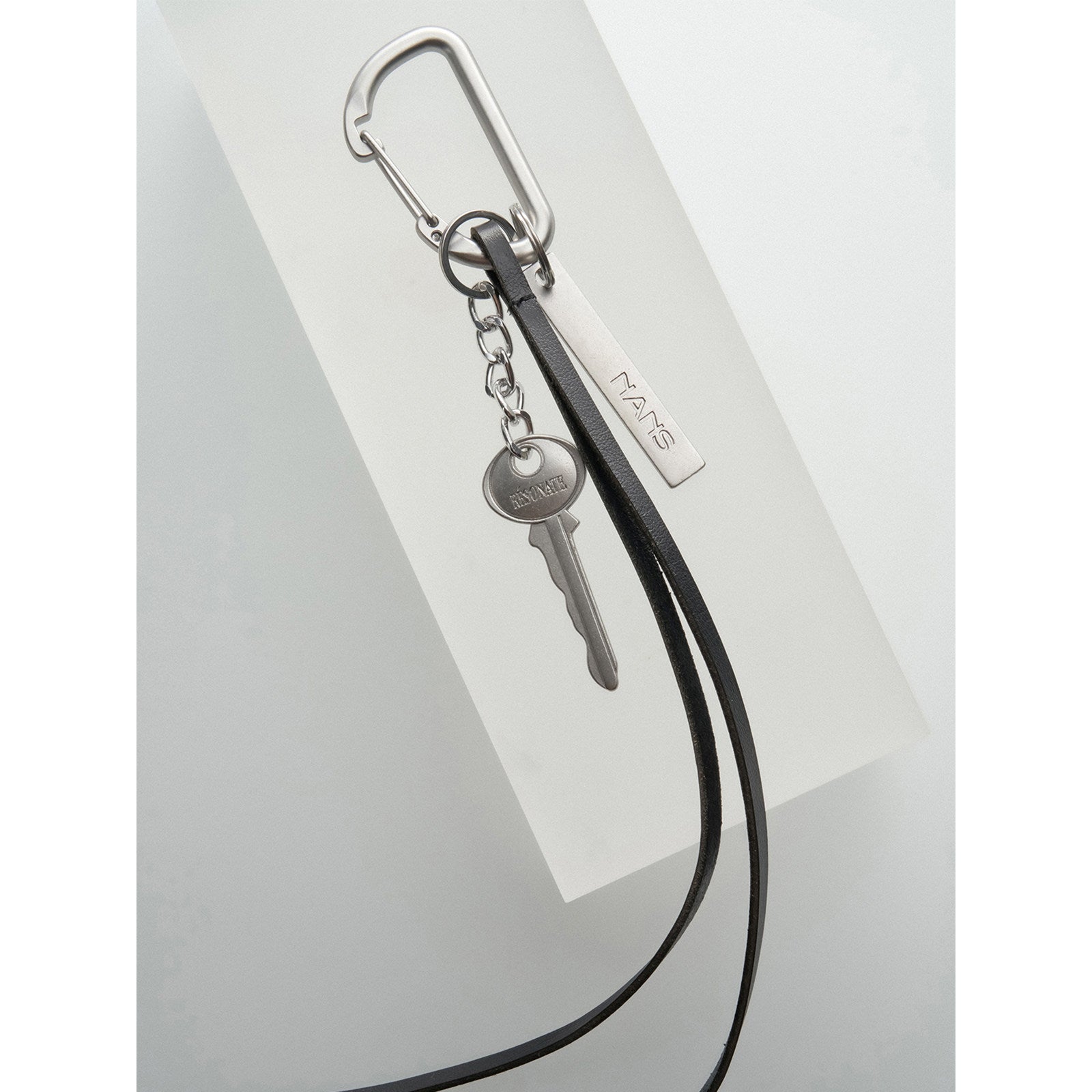 特注のヴィンテージ風キーデザインに「RESONATE」の文字が刻印され、ロゴ入りの金属プレートと本革コードがあしらわれた、キーホルダー、回転式キーリング、キーリングが一体となったアクセサリー。