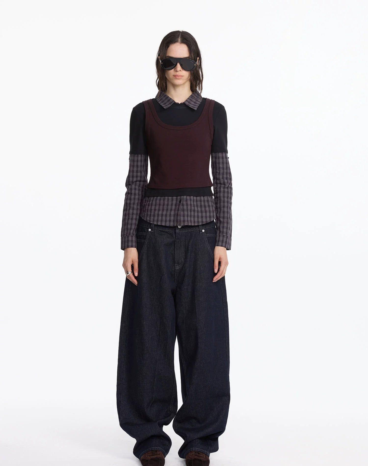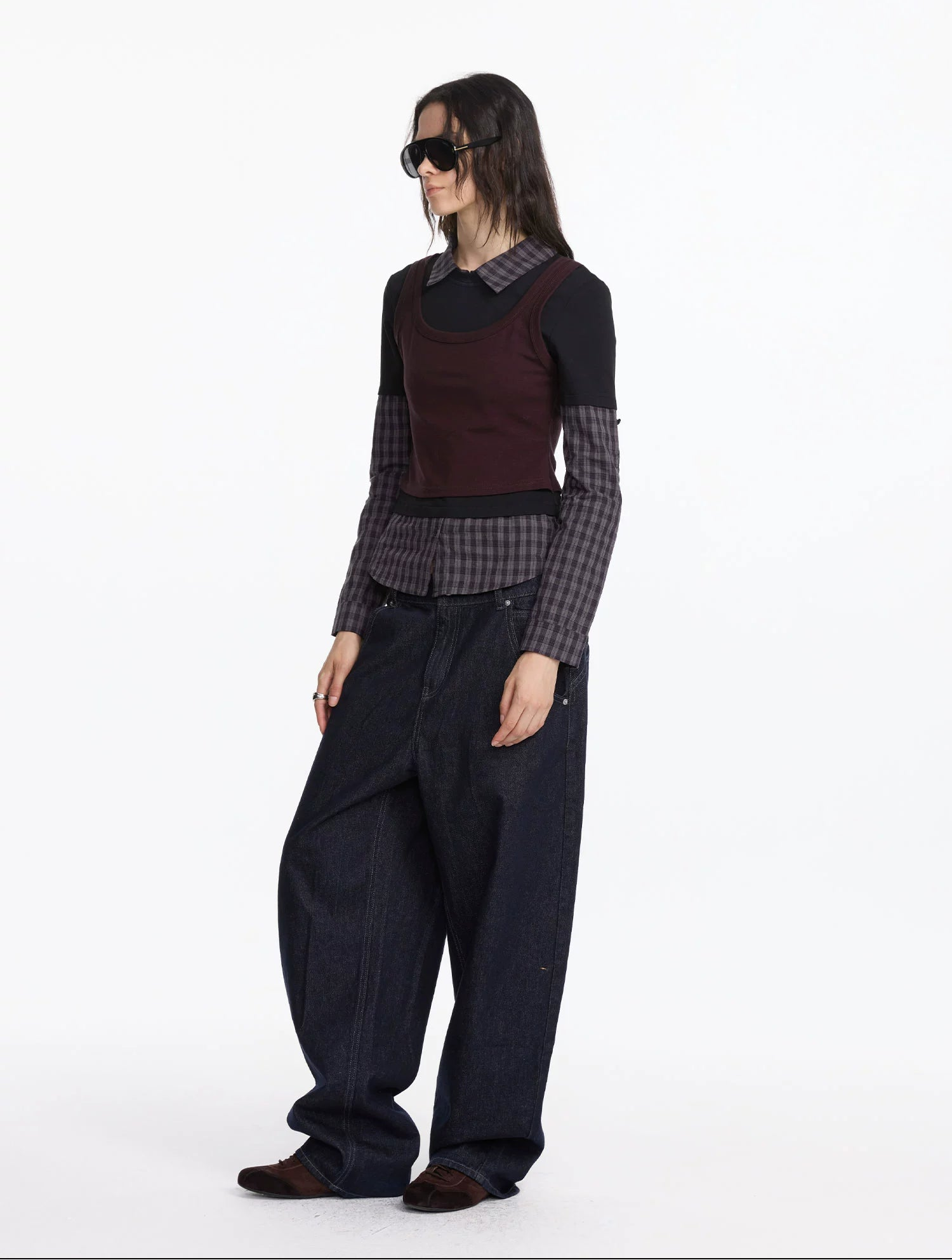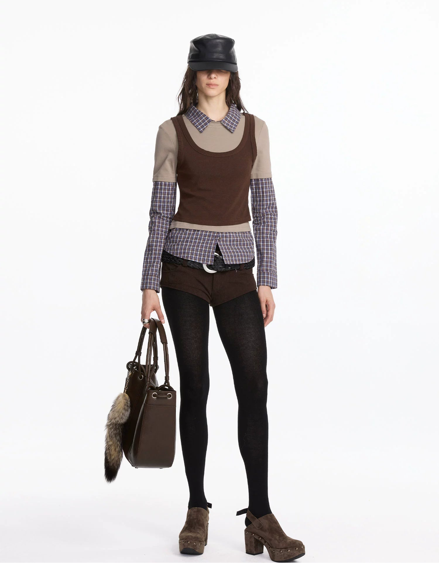 Fake Layered Plaid Polo Long Sleeve T-shirt