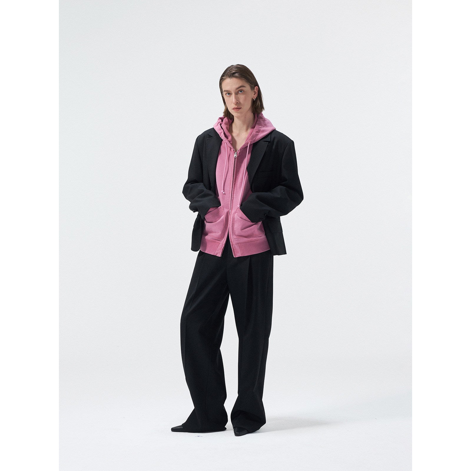 テーラードカットにより、シャープでスタイリッシュな着心地を実現し、薄手のショルダーパッドが肩のラインを整え、すっきりとしたシルエットを作り出します。