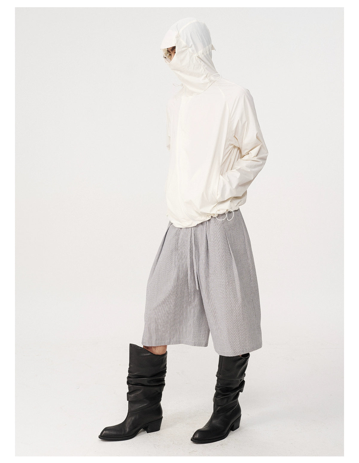 斜めのジッパー開閉部には、複数の調節可能なドローストリングが付いております。